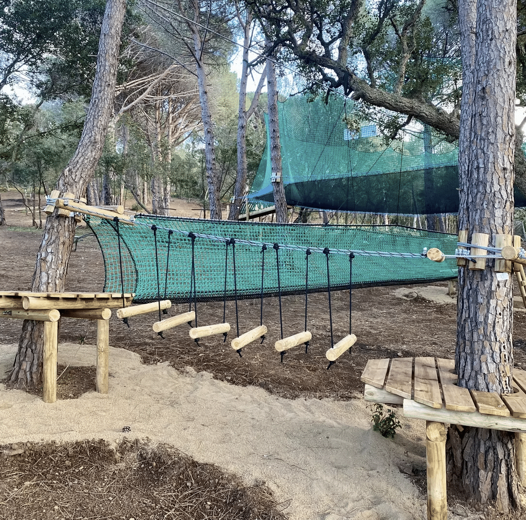 Pour compléter l’expérience, nous avons conçu un Parcours Aventure sans ligne de vie continue, installé à seulement 80 cm du sol. Cet aménagement permet aux enfants d’évoluer en toute liberté et sécurité à travers 4 jeux ludiques, avec en point d’orgue une tyrolienne de 28 m pour les premières sensations fortes.