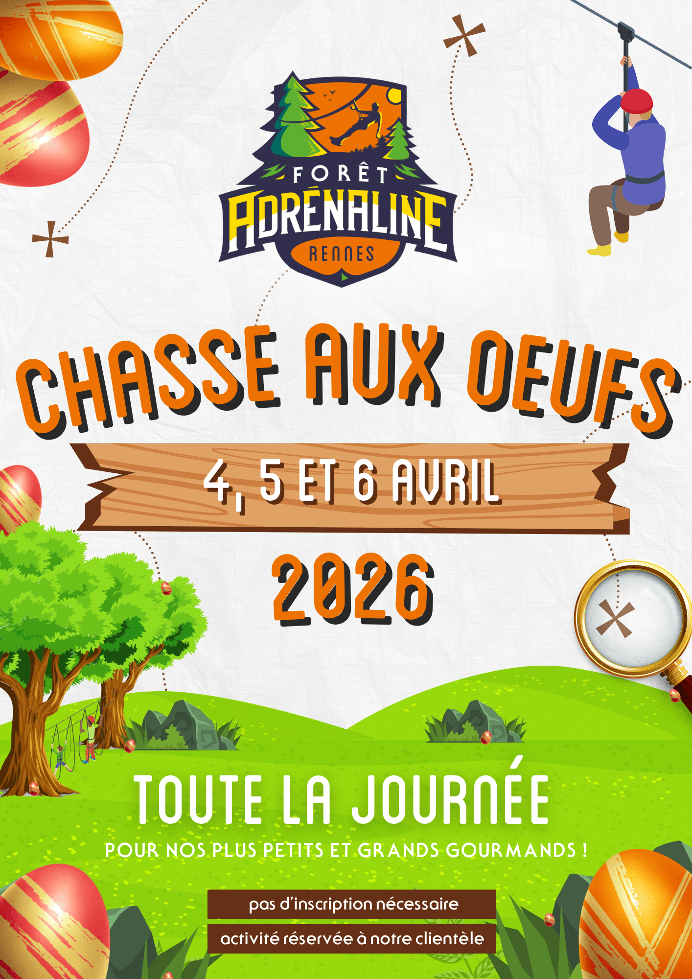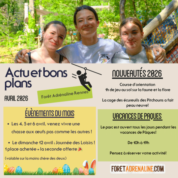 Joyeuses Pâques ! Les 4, 5 et 6 Avril 2026 : Grande chasse aux oeufs ! Gourmands, Sportifs, venez vous régaler et gagner de nombreux lots! *Activité réservée aux clients ayant pris une entrée (accrobranche/TrampÔforest/CO) Journée des loisirs Le dimanche 12 Avril Une entrée achetée = une entrée offerte!**Sur la moins chère des deux Vacances…