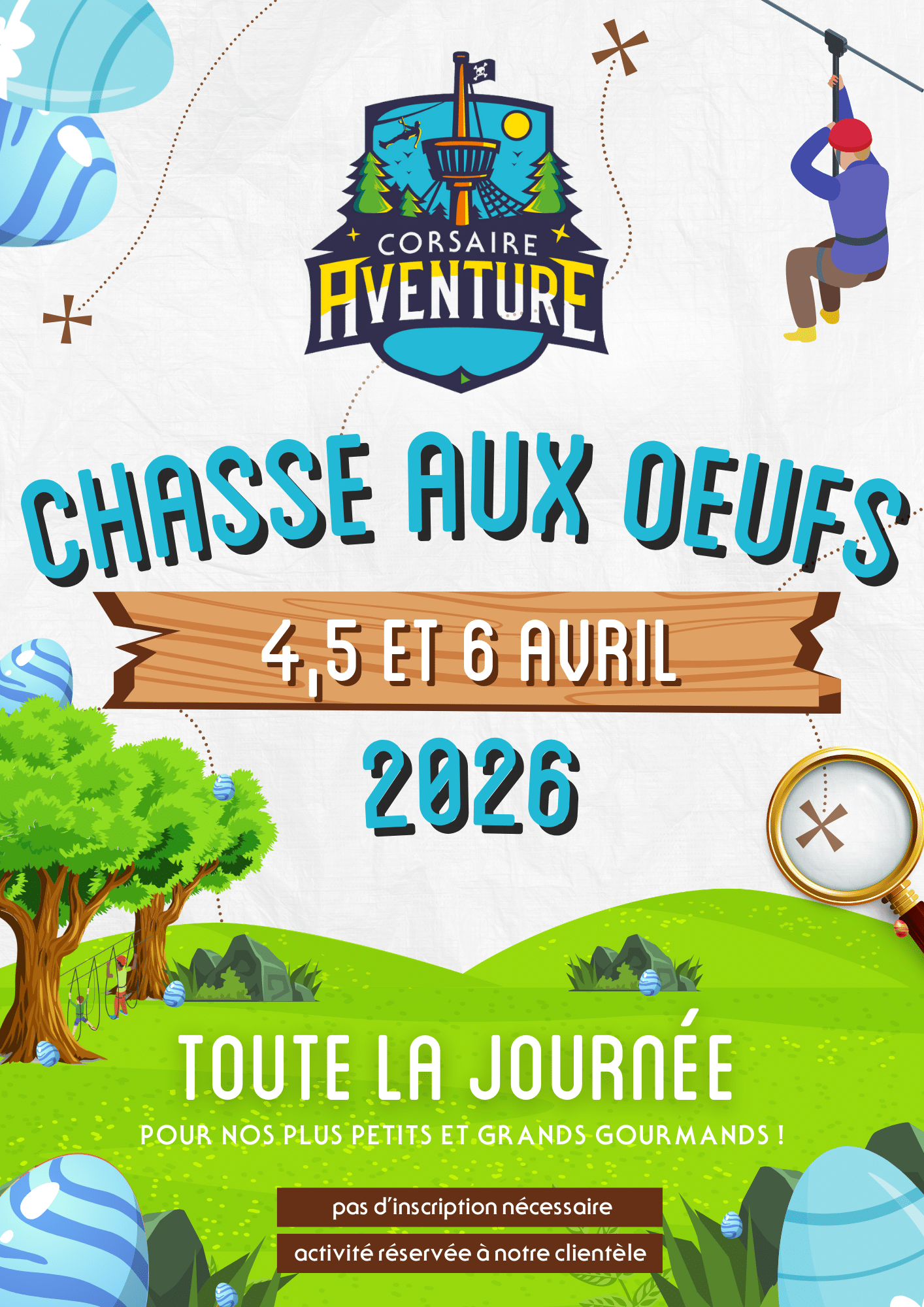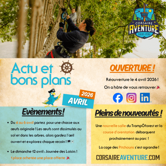 Réouverture du parc le 4 Avril ! Nous avons hâte de vous retrouver! Les 4, 5 et 6 Avril 2026 : Grande chasse aux oeufs ! Gourmands, Sportifs, venez vous régaler!*Activité réservée aux clients ayant pris une entrée Le dimanche 12 Avril Une entrée achetée = une entrée offerte!**Sur la moins chère des deux